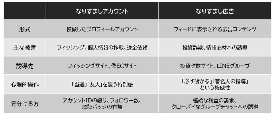 なりすましアカウントとなりすまし広告の違いを比較表で整理しました。