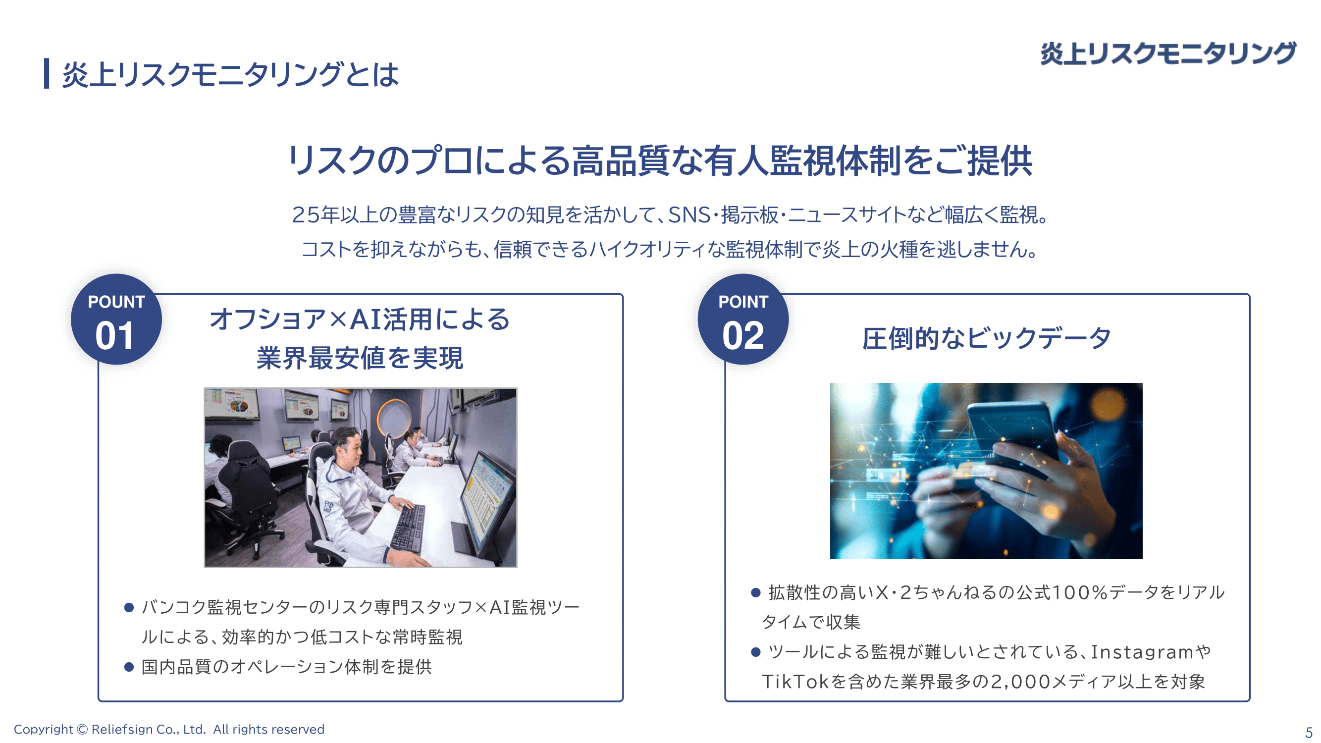 炎上リスクモニタリングのサービス資料ダウンロードページです。 深夜・休日問わず炎上リスクを見逃さない、SNSリスクに精通したオペレーターによる、安心のリアルタイム有人監視サービスです。