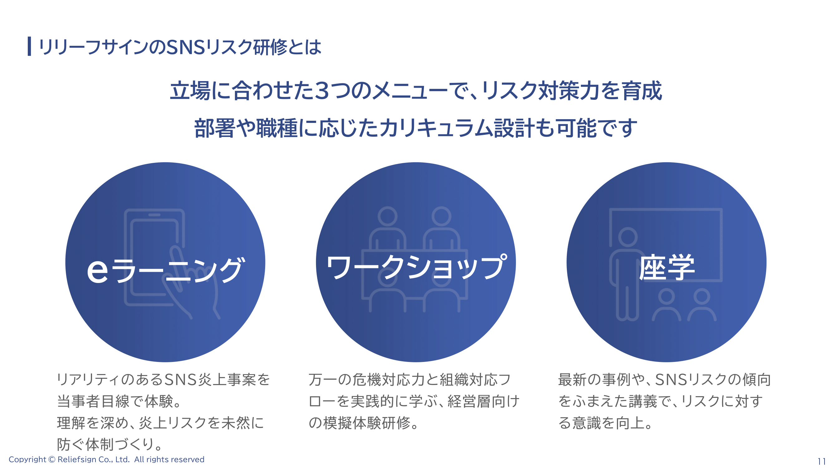 SNSリスク研修プログラムのサービス資料ダウンロードページです。 立場に合わせた3つの研修メニューで、SNSリスクの理解を深め、企業に必要な危機対策力を育成する研修プログラムです。